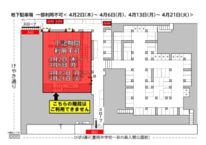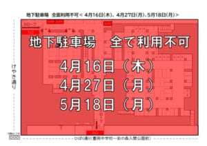 工事に伴い、下記のとおり地下駐車場の利用制限が発生します。(日にちによって制限範囲が異なります)。